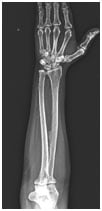 A 50-year lady from the remote village of Rajasthan presented with history of chronic back pain with spinal stiffness was referred to rheumatology clinic as a case of ankylosing spondylitis because spinal radiographs had been reported as “bamboo spine “. Previously patient had multiple spinal MRIs and x rays, orthopedic consultations, and general physician consultations without significant benefit in symptoms. In rheumatology clinic, recent investigations showed normocytic normochromic anemia, normal renal and liver function, normal ESR and CRP and negative rheumatoid factor, anti CCP antibody and ANA. Her back pain was of mechanical in nature and no history of peripheral arthritis. No other systemic issues in medical history without any history of other medical disorders. Her clinical examination showed restricted spinal movements with modified Schober’s test of 1 cm without any signs of peripheral arthritis. Further review of previous radiographs showed ossification of the attachments of tendons and ligaments and periosteal bone formations. A radiograph of forearm was requested to confirm the diagnosis.